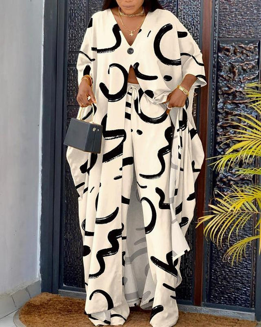 Comfea® Abstract Print High Slit Longline Top & Pants Set