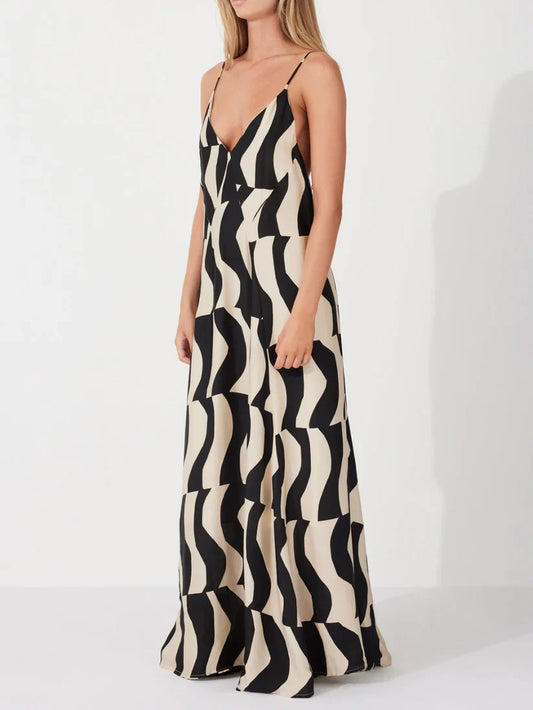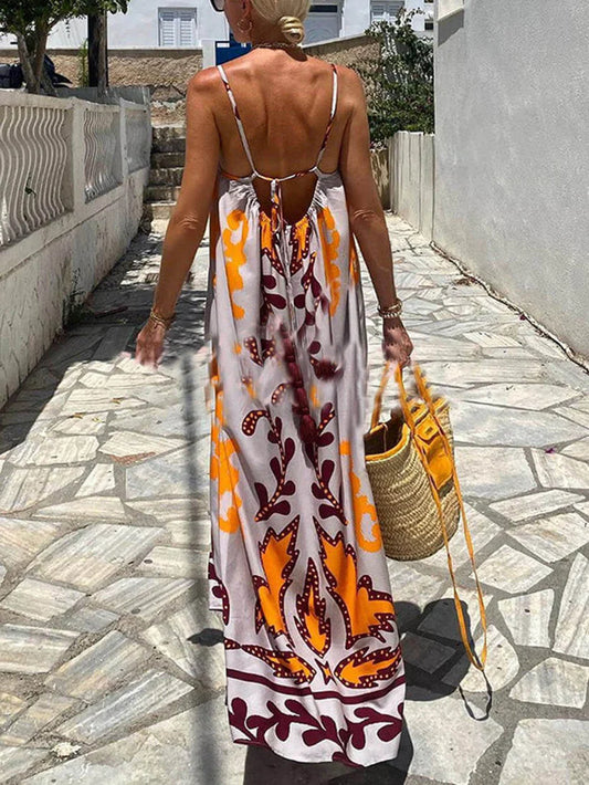 Unique Color Block Stitching Print Backless Slim Fit Maxi Dress
